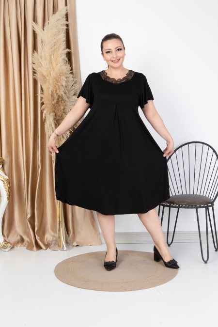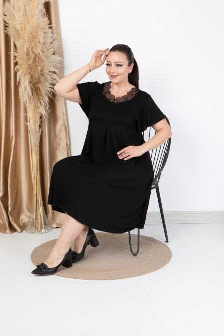 KADIN BÜYÜK BEDEN LİKRALI VİSKON DANTEL DETAY SİYAH ELBİSE
