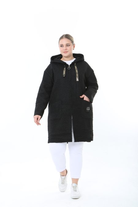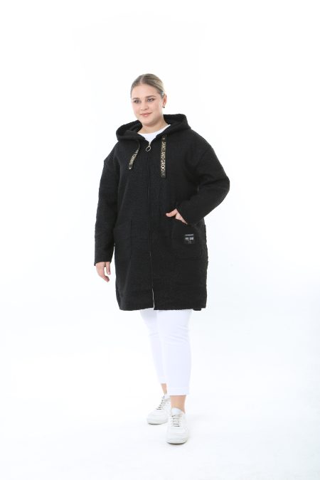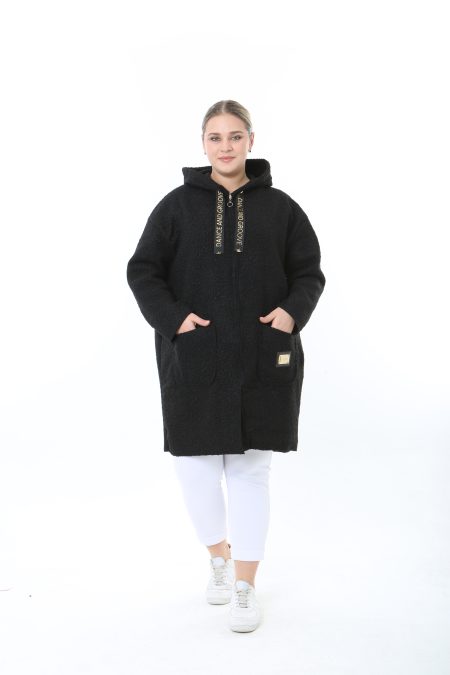 XL Modam KADIN PONPON KAŞE KAPÜŞONLU BÜYÜKBEDEN SİYAH KABAN