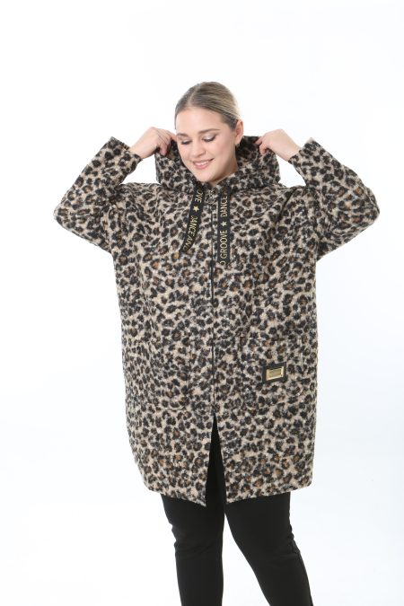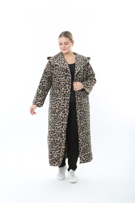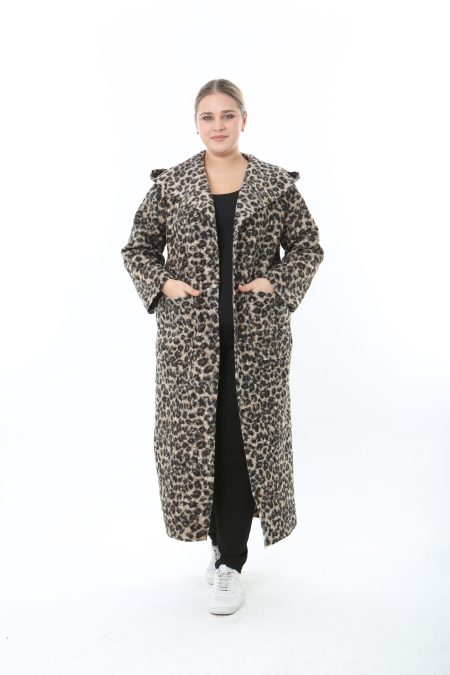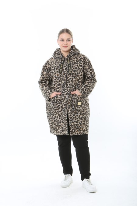 KADIN PONPON KAŞE KAPÜŞONLU BÜYÜK BEDEN LEOPAR KABAN